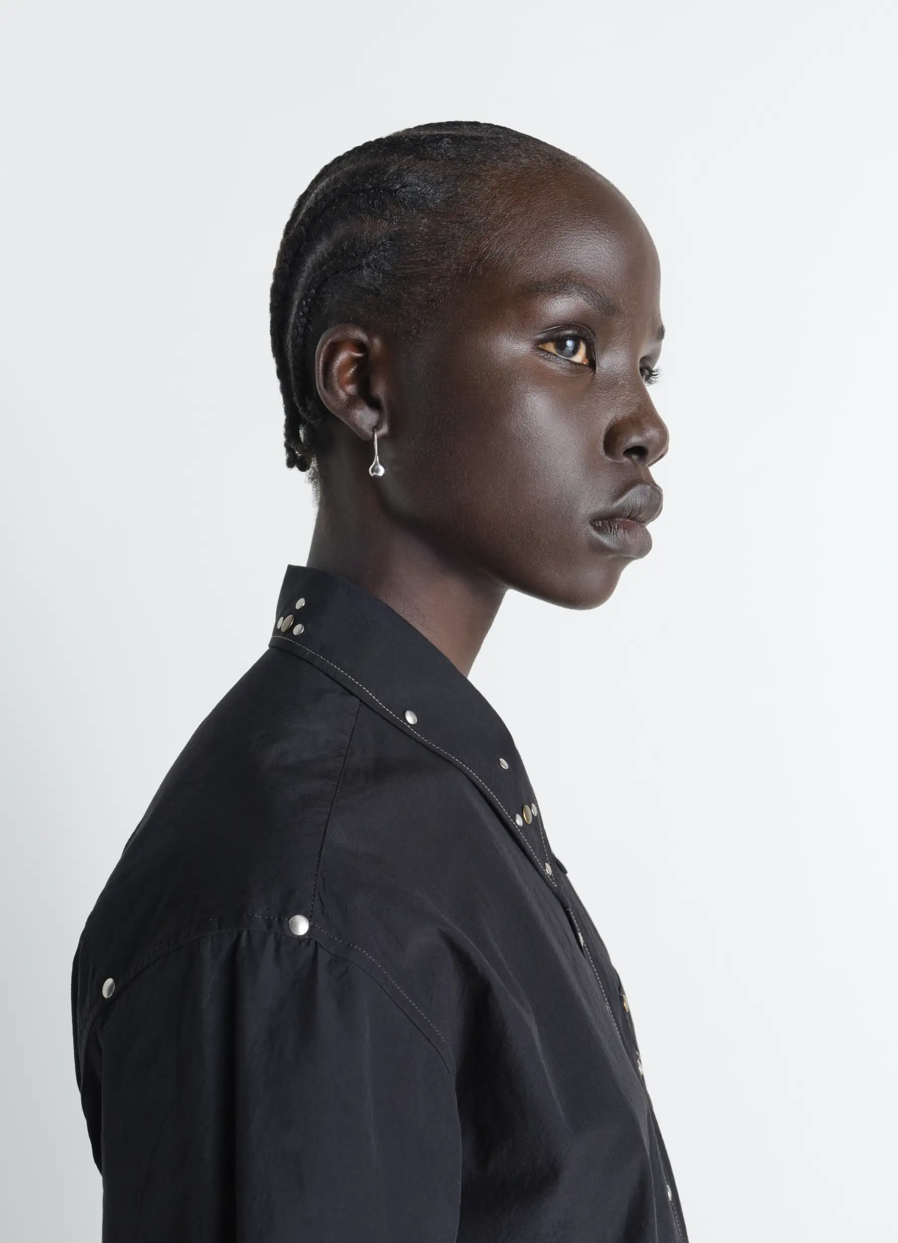 This four-piece piercing set is crafted in rhodium-plated silver and resin. Their shapes are inspired by the various Lemaire jewelry lines, offering multiple possibilities for pairing.